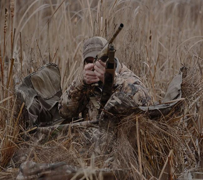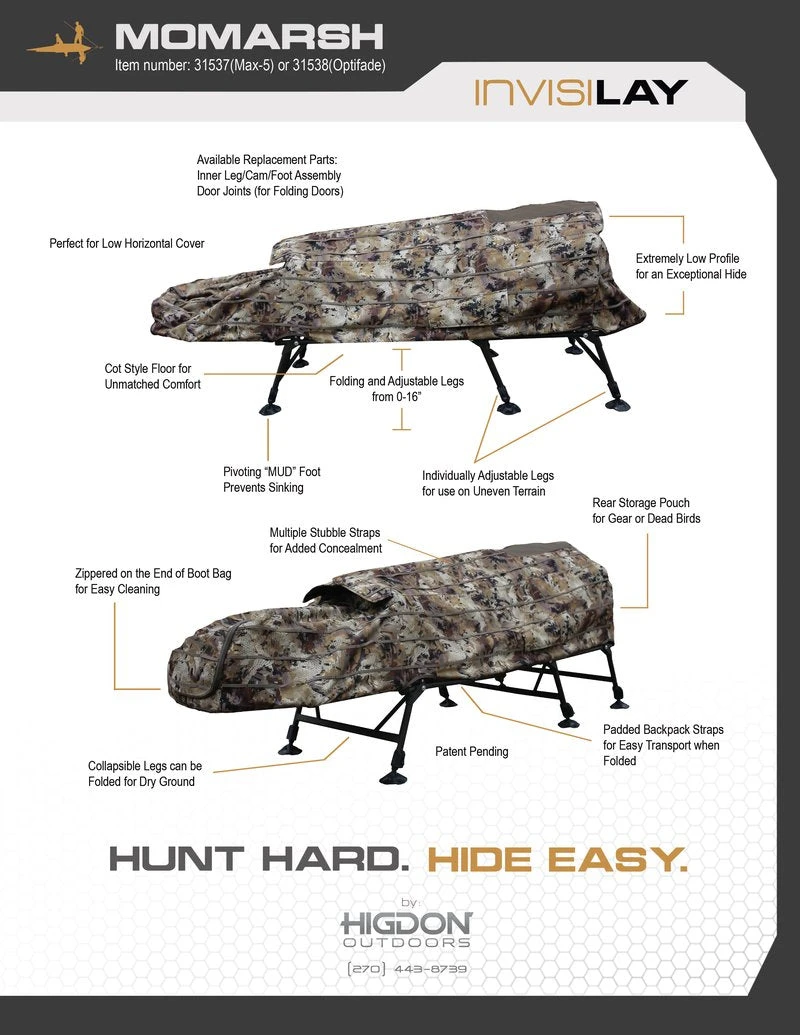 The AT-X combines the aquatic versatility of a layout boat with the portability and compact size of a layout blind. With three sets of folding legs that are each independently adjustable; the AT-X is as effective and comfortable in shallow water settings as it is on dry ground. The same innovative telescoping legs and “duck- style” feet that MOmarsh first introduced with their Invisichair and Invisilab blinds, keep the Invisilay from sinking into the mud. Once erected, the legs are adjustable from 10 to 16 inches of height. Padded back pack straps allow for convenient portability when hunting walk-in areas. If you are tired of buying several different blinds for multiple hunting situations, then look no further. So whether you are chasing early season ducks or late season honkers in dry corn fields; the AT-X is your all in one tool for all your field or water needs.